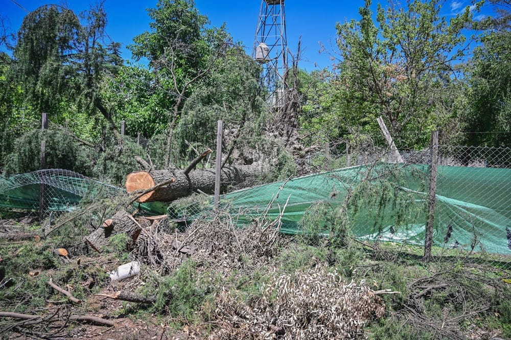 Gracias a las medidas de podas preventivas realizadas a mitad de este año los corrales no sufrieron daños, por lo cual todos los animales que viven en este espacio no sufrieron heridas de ningún tipo y se encuentran en buen estado de salud. Sin embargo, los fuertes vientos provocaron la caída de un pino, la voladura de chapas y el desprendimiento de ramas que dañaron algunas oficinas, los módulos de los baños y los alambrados perimetrales.